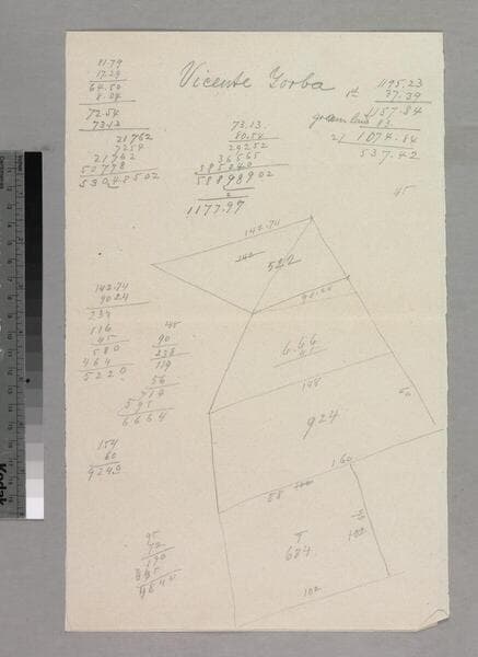 Bound volume: Rancho La Sierra, Partition 1876-1877. #16A: 8x13 sheet, pencil on paper; courses, distances, acreage; #16B: "Vicente Yorba" sketch map on 26 x 8 1/4 in sheet. Title supplied by cataloger.