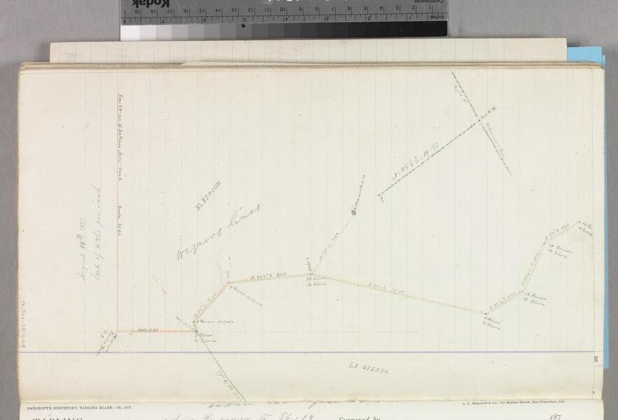 Bound volume: Rancho La Sierra, Partition 1876-1877. Verso & recto of same sheet, showing courses, distances; parcel owners; color on verso map; . Title supplied by cataloger.