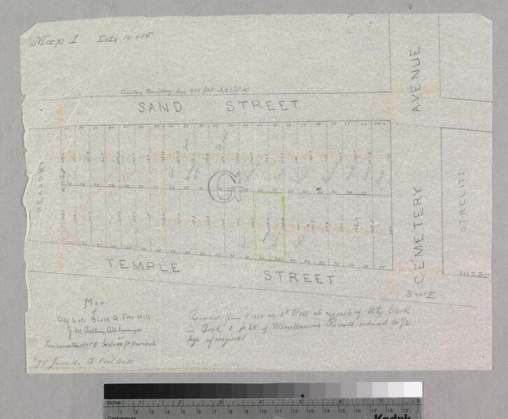 Sand to Temple St., west from Cemetery Ave., with lot owners; red, black ink with color highlighting. . Alt title supplied by cataloger.