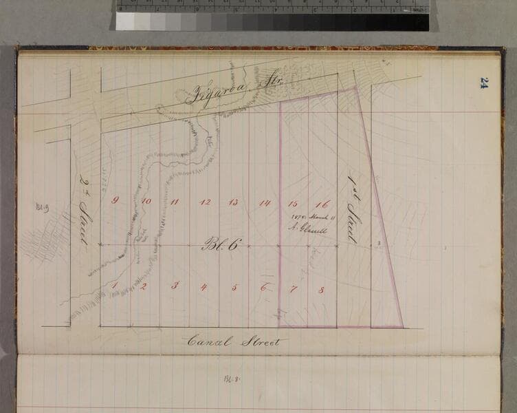 Pgs. 4-68 [not consecutive pages] of bound volume, "Subdivision of Lots 500, 501, 502 and 503 of Canal and Reservoir Lands," maps of varying sizes, showing block & lot numbers, penciled details, hachures, parcel owners, field notes; Block 13 having the most detail & note activity [bordered by Mill, 4th, Pearl & 5th streets]. Alt. title supplied by cataloger.