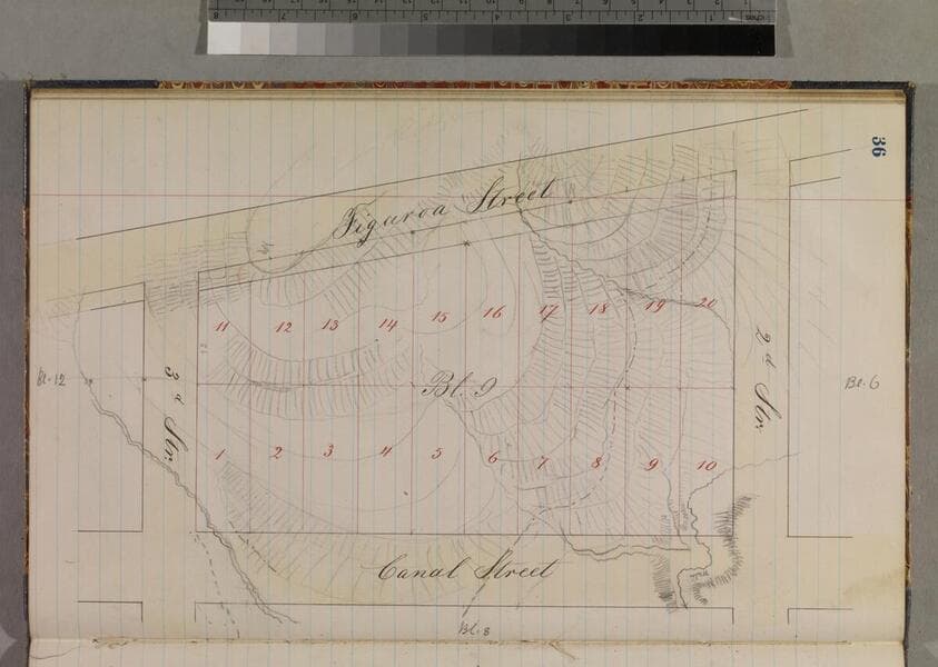 Pgs. 4-68 [not consecutive pages] of bound volume, "Subdivision of Lots 500, 501, 502 and 503 of Canal and Reservoir Lands," maps of varying sizes, showing block & lot numbers, penciled details, hachures, parcel owners, field notes; Block 13 having the most detail & note activity [bordered by Mill, 4th, Pearl & 5th streets]. Alt title supplied by cataloger.