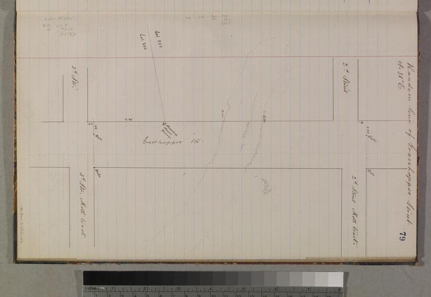 Pgs. 81-83 of bound volume, "Subdivision of Lots 500, 501, 502 and 503 of Canal and Reservoir Lands," showing hachures, markers; 1st Street, Mott Tract, Flower Street. Title supplied by cataloger.