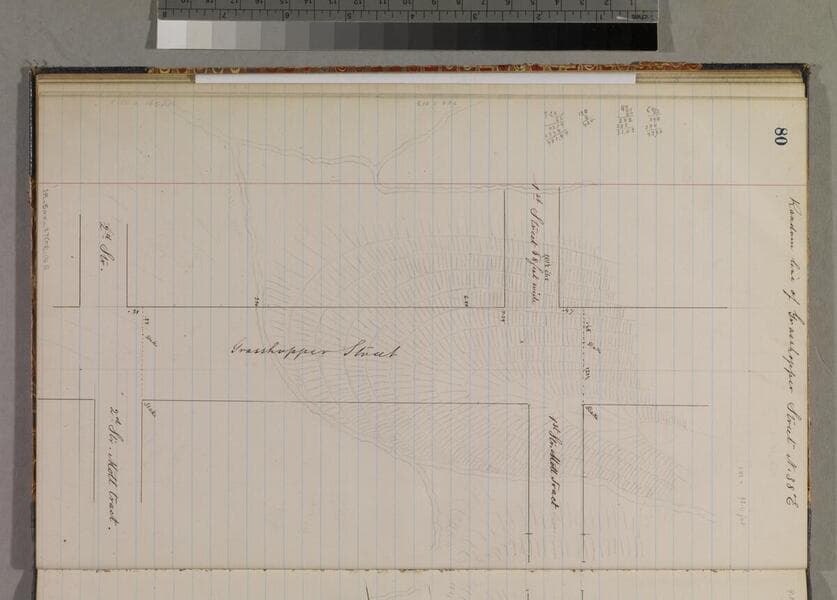 Pgs. 81-83 of bound volume, "Subdivision of Lots 500, 501, 502 and 503 of Canal and Reservoir Lands," showing hachures, markers; 1st Street, Mott Tract, Flower Street. Title supplied by cataloger.