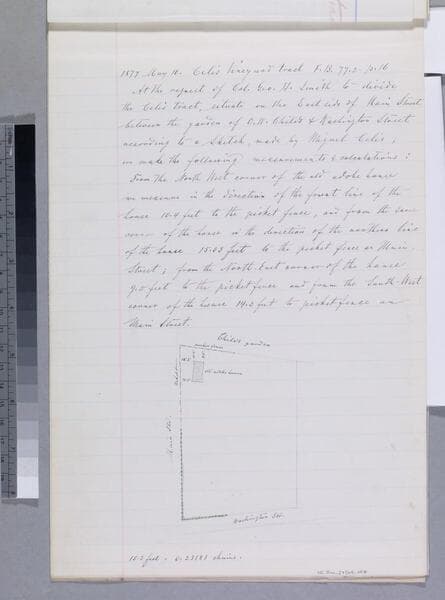 Pgs. 18-19 of stapled document, "The Celis Vineyard Tract..." showing courses, distances, structures, streets. Title supplied by cataloger.