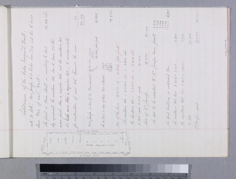 P. 27 of stapled document, "The Celis Vineyard Tract..." as well as loose documents following; showing courses, distances; tracts bordered by Main & Pine Streets. Title supplied by cataloger.