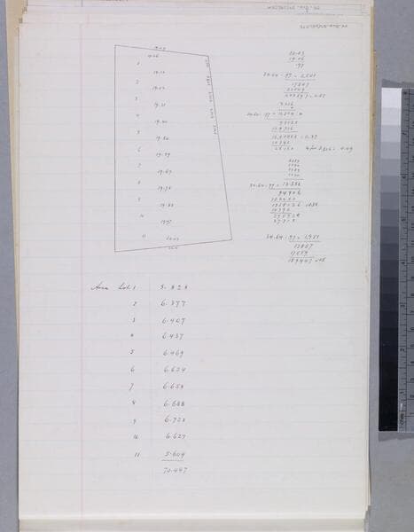 P. 27 of stapled document, "The Celis Vineyard Tract..." as well as loose documents following; showing courses, distances; tracts bordered by Main & Pine Streets. Title supplied by cataloger.