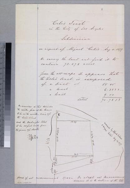 Pgs. 18-19 of stapled document, "The Celis Vineyard Tract..." showing courses, distances, structures, streets. Title supplied by cataloger.