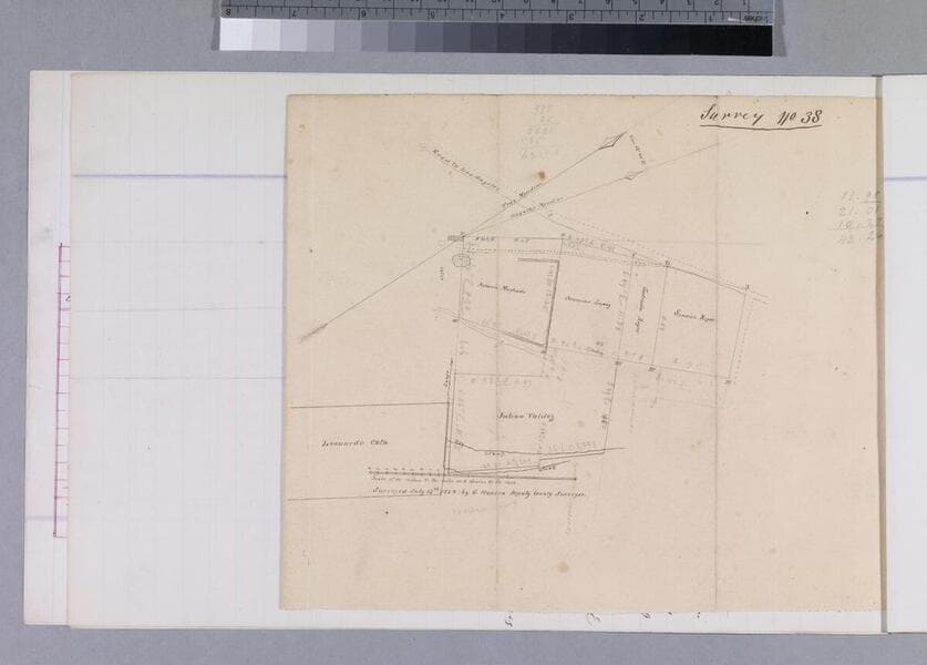 Within folder labeled, "O.W. Childs Partitions," on page 2 of "Gertrudes Reyes to Jeronimo Lopez..." Certified copy by Hansen; showing courses, distances, structures, minute surface details, parcel owners, public road to Los Angeles; may be Survey no. 38. Title supplied by cataloger.