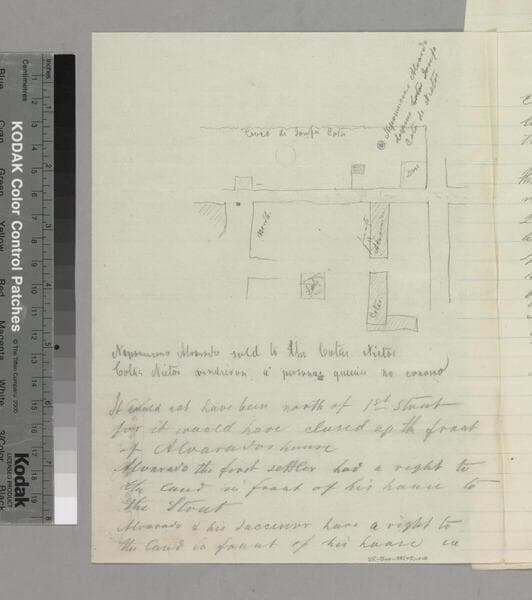 #1A: sketch on O'Melveny & Trantum stationery [from O.O. Trantum] showing lot with water ditches & S.P. railroad, structure, distances, markers; #1B: very rough sketch on verso; additional sketch on sheet with courses & calculations, showing River, Chavis and other parcel owners [not scanned]. Title supplied by cataloger.