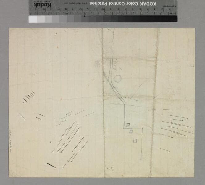 #1A: sketch on O'Melveny & Trantum stationery [from O.O. Trantum] showing lot with water ditches & S.P. railroad, structure, distances, markers; #1B: very rough sketch on verso; additional sketch on sheet with courses & calculations, showing River, Chavis and other parcel owners [not scanned]. Title supplied by cataloger.