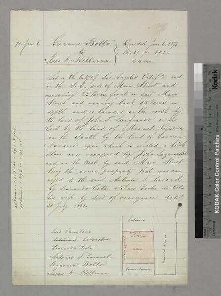 Manuel Requena lot on Los Angeles & Requena Sts: #1A, "I.W. Hellman"; #1B, "Giacomo Bollo to Isias W. Hellman..." not showing streets, only parcel owners, distances in varas. Title supplied by cataloger.
