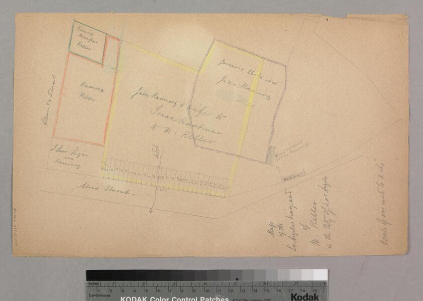 Showing color highlighted lots of Ramirez, Rimpau, Keller and numerous numbered lots facing Aliso Street at Alameda; structures, courses, distances. Alt. title supplied by cataloger.