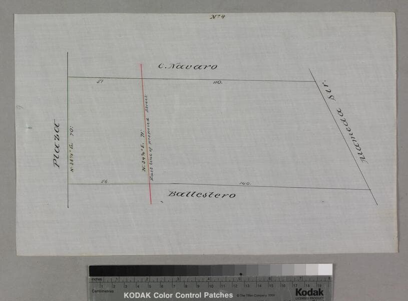 Within fastened document, "Los Angeles Street Extension..." maps numbered No. 1- No. 15, with color highlighting; showing courses, distances, bordering parcel owners from Plaza/Olvera St./Negro Alley to Alameda St./Rimpau. Alt title supplied by cataloger.
