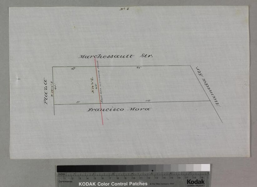 Within fastened document, "Los Angeles Street Extension..." maps numbered No. 1- No. 15, with color highlighting; showing courses, distances, bordering parcel owners from Plaza/Olvera St./Negro Alley to Alameda St./Rimpau. Alt title supplied by cataloger.