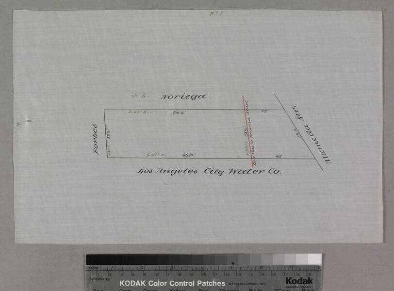 Within fastened document, "Los Angeles Street Extension..." maps numbered No. 1- No. 15, with color highlighting; showing courses, distances, bordering parcel owners from Plaza/Olvera St./Negro Alley to Alameda St./Rimpau. Alt title supplied by cataloger.