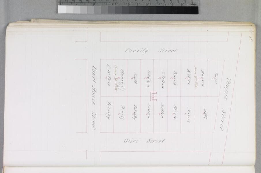 Beginning on p. 26 of previous bound document, starting with section 48, then sections A-Z, showing courses, distances, parcel owners, surface details; Tiffney parcels are more detailed. Title supplied by cataloger.
