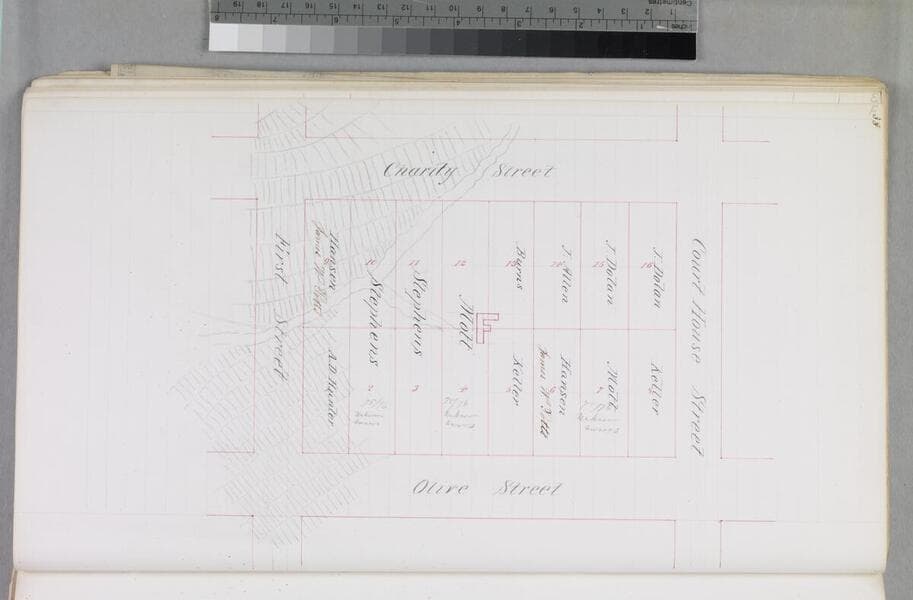 Beginning on p. 26 of previous bound document, starting with section 48, then sections A-Z, showing courses, distances, parcel owners, surface details; Tiffney parcels are more detailed. Title supplied by cataloger.