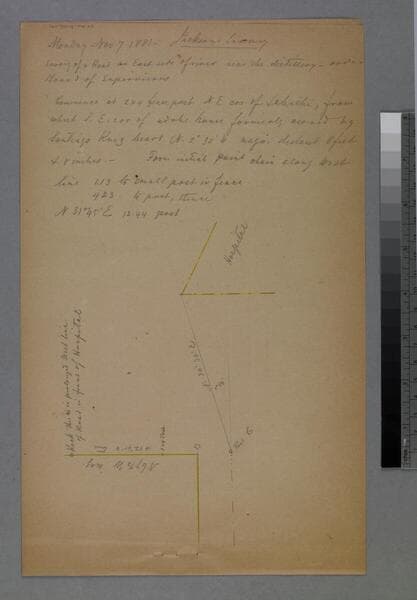 P. 2 of pinned document, "Road to San Gabriel in front of the Ruiz tract..." showing parcel, courses, distances. Title supplied by cataloger.