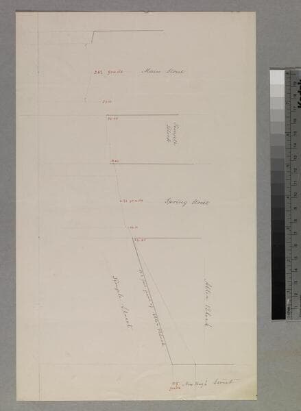 Showing Temple south of New High & Spring streets with grades; second sheet shows Temple north of New High to Main Street, Temple & Allen Blocks, with grades (in red on both sheets). Title supplied by cataloger.