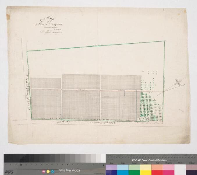 Original survey by P. B. Molera March 9, 1878 [title info says April]. ; Copied by Alfred Solano.. East bank Los Angeles River, Rose (Kuhrts) St. to Mission Road, showing structures and surface detail, dense ; hachures, vineyard & other vegetation; adjacent parcel owners. Two tables of boundaries with courses, distances . Verso: Frank Sabichi. Alt title supplied by cataloger.