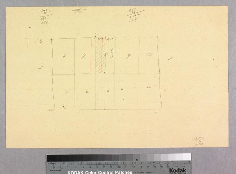 Seventh to Ninth St., west of Figueroa St., with title history (1875-1879), some distances. Verso: sketch map of unidentified parcel divided into 10 sections: sec. 8 subdivided with pink lines; calculations. Title supplied by cataloger.