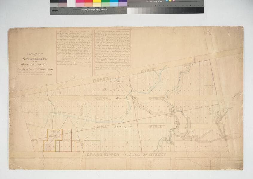 First map of bound volume, "Subdivision of Lots 500, 501, 502 and 503 of Canal and Reservoir Lands," showing lots 500, 501,503 with numbered sections & lots, between Diamond St. to the north, 5th to the south; Figueroa to the west and Chapuline [Pearl] to the east; with courses, distances. Title supplied by cataloger.