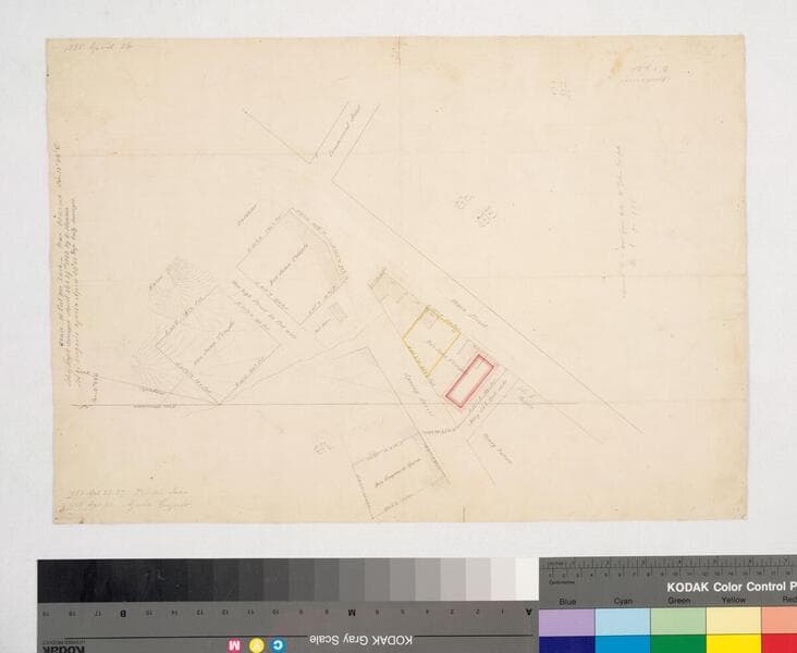 Original survey by Hansen: December 17, 1856 . Main to New High St., showing structures; color highlighting, bearings, distances; pencil calculations. Alt title supplied by cataloger.