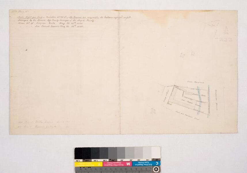 Original survey: ; May 18,1858. Adjacent parcel: Del Valle. Two zanjas tinted blue; hachures; pencil calculations. Alameda Street to the east. Alt title supplied by cataloger.