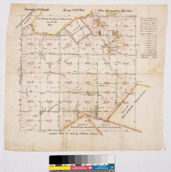 Bordered by Rancho San Francisco. Soledad & Mint canyons and north, showing surface detail, topography, acreages, courses & section numbers; road from Newhall to Elizabeth Lake, S.P.R.R.; red & blank ink with color wash. Alt. title supplied by cataloger.