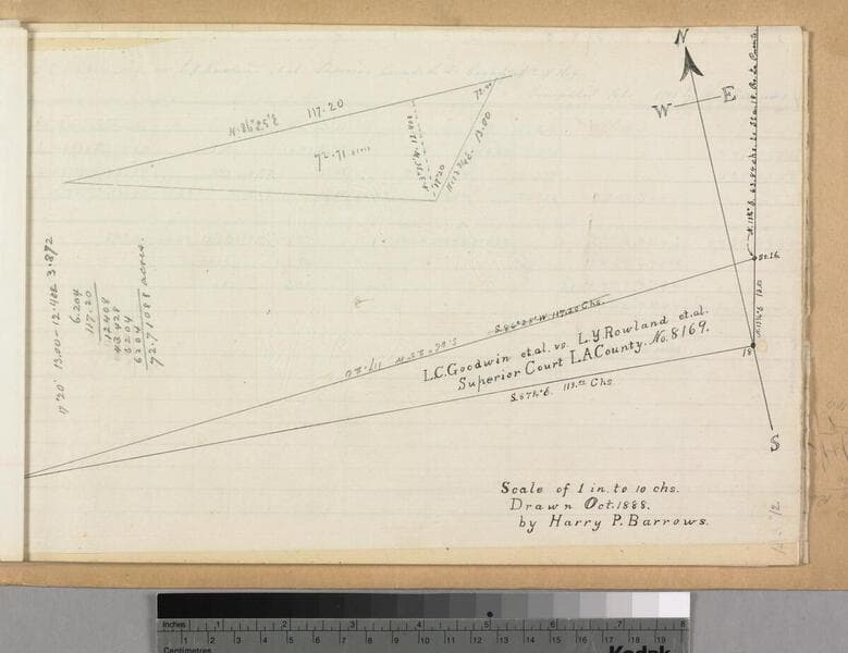 This and the rest of the maps are bound in folder: "Goodwin et al vs. Rowland, Survey of Rancho la Puente..." p. 24; color highlighting, courses, distances, acreage; penciled calculations & notations. Title supplied by cataloger.