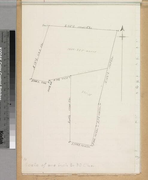 This and the rest of the maps are bound in folder: "Goodwin et al vs. Rowland, Survey of Rancho la Puente..." p. 24; color highlighting, courses, distances, acreage; penciled calculations & notations. Title supplied by cataloger.