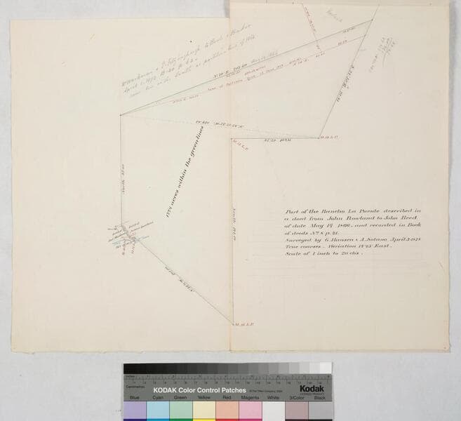 Part of bound deed: "Ro. La Puente, Sentous Bros., William Workman & Peregriuse Fitzhugh to E.F. Beale & Robert S. Baker..." Color highlighting, courses, distances, acreage, parcel owners, minor surface detail. Alt. title supplied by cataloger.