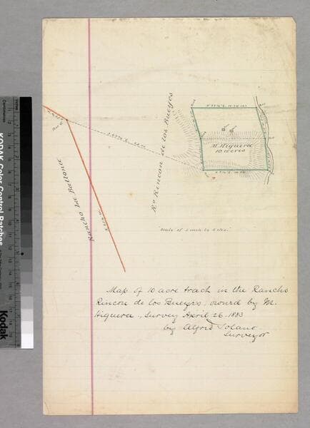 Bordered by Ranchos Los Cerritos & San Pedro Showing courses, distances, acreage, occupants; color highlighting, minor surface details Survey requested by Don Manuel Dominguez. Alt. title supplied by cataloger.