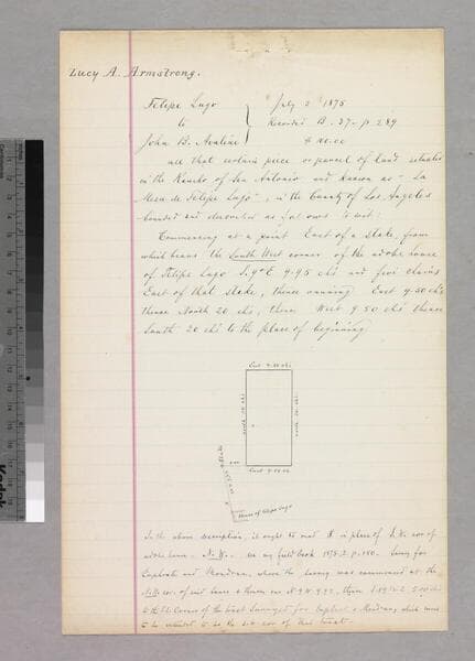 Map on second leaf of document labeled, "Lucy A. Armstrong, Felipe Lugo to John B. Avaline..." with color highlighting. Shows distances, House of Felipe Lugo, markers, 35-acre lots, Hostetter Avenue. Title supplied by cataloger.