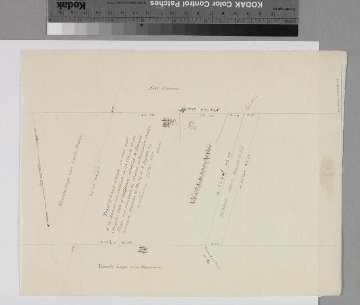...surveyed at the request of Bishop Taddeus Amat; courses, distances, structures, vegetation, parcel owners, deed history; show Main, Second & Los Angeles streets, Weinshank Barrows, two zanjas. Alt. title supplied by cataloger.