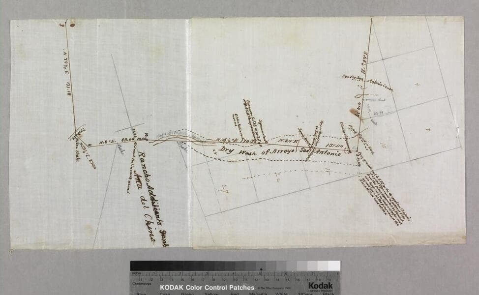 Within document, "Rancho San Antonio, Patent," page 3; with color highlighting, courses & distances. Title supplied by cataloger.