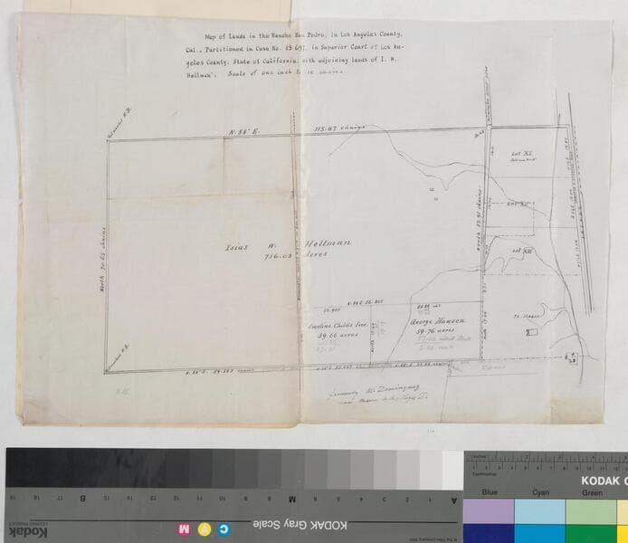 P. 13 of document: "Rancho San Pedro, Manuel Dominguez, Dominguez Heirs partition 1884/85... Dominguez Colony" showing courses, distances; minor color highlighting, parcel owners; acreage. Title supplied by cataloger.
