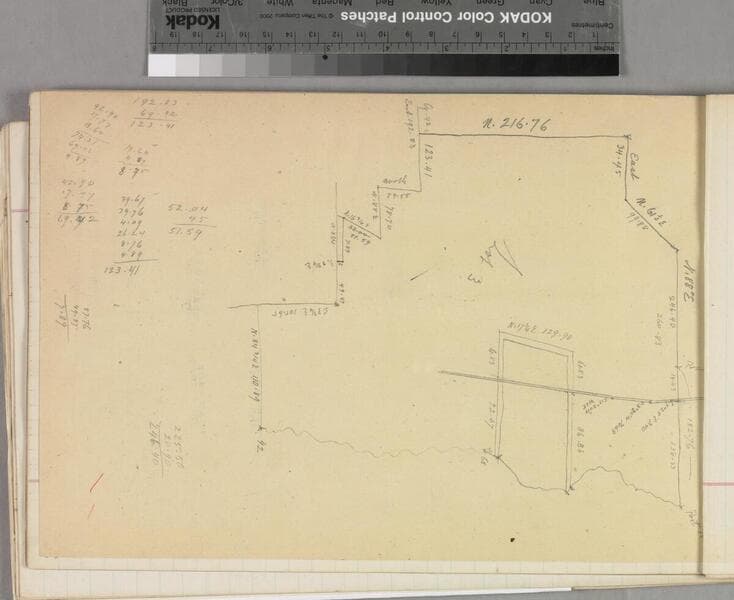 Bound within document: "1884-1885, Rancho San Pedro, Dominguez Heirs partition... to the honorable the Superior Court..." located on verso of p. 44, color highlighting, distances, calculations. Title supplied by cataloger.