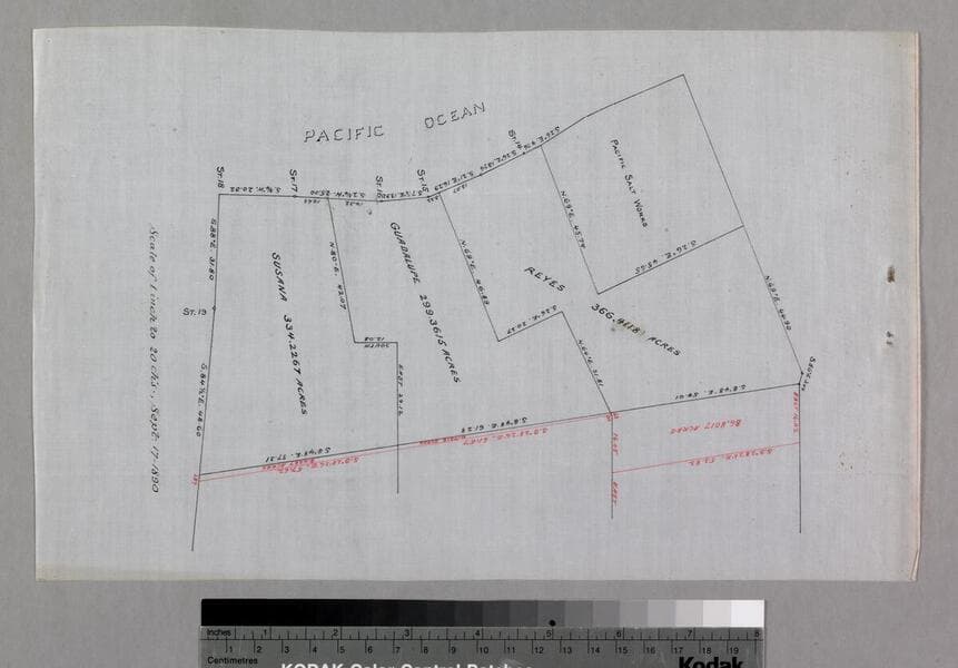 Showing Pacific Salt Works, courses, distances, parcel owners, stations; red ink, green highlighting. Title supplied by cataloger.