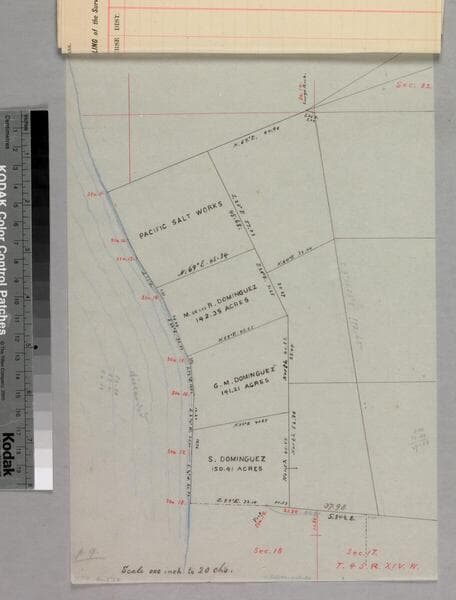 Showing Pacific Salt Works, courses, distances, parcel owners, stations; red ink, green highlighting. Title supplied by cataloger.