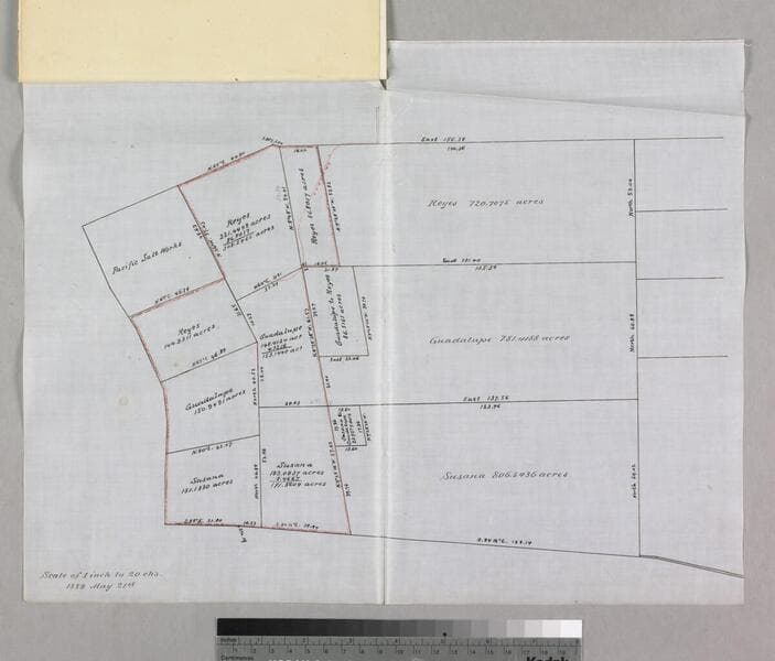 Part of stapled document, "Allotment to Susana Dominguez..." Tract No. 2 featuring Guadalupe & Susana parcels, color outlining, courses, distances; sand hills & goat land. Title supplied by cataloger.