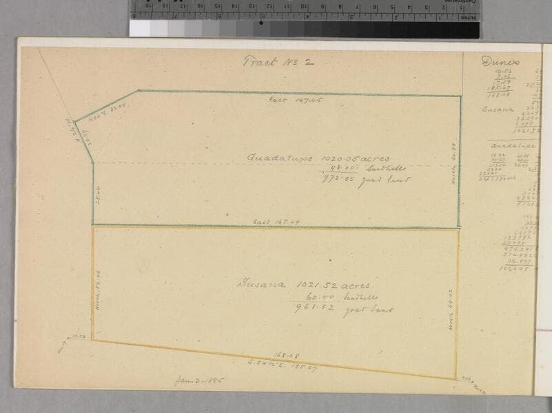 Pacific Ocean Part of stapled document, "Allotment to Susana Dominguez..." showing 2 parcels with acreage, courses, distances; color highlighting (very faded). Title supplied by cataloger.