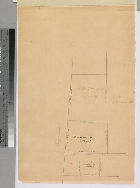 Pacific Ocean Part of stapled document, "Allotment to Susana Dominguez..." showing 2 parcels with acreage, courses, distances; color highlighting (very faded). Title supplied by cataloger.