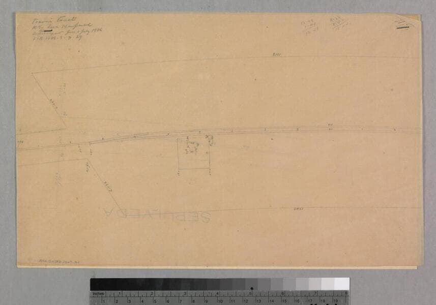 Showing parcel owners, courses, distances, structures, San Jose Hills, Road to Jurupa [Riverside]. Alt. title supplied by cataloger.
