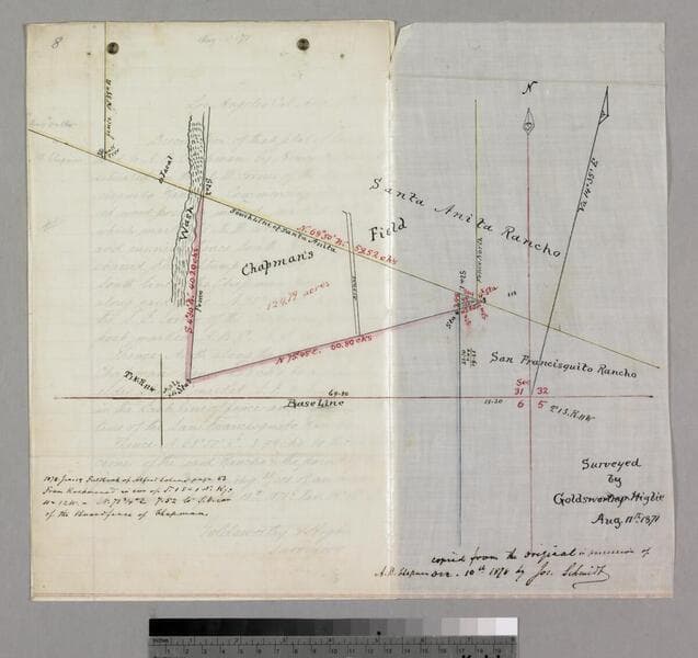 Fastened to table: "Description of land of L.J. Rose..."; showing township numbers, boundary markers, courses, distances, parcel owners; color highlighting Paper watermark: J. Whatman 1867. Title supplied by cataloger.