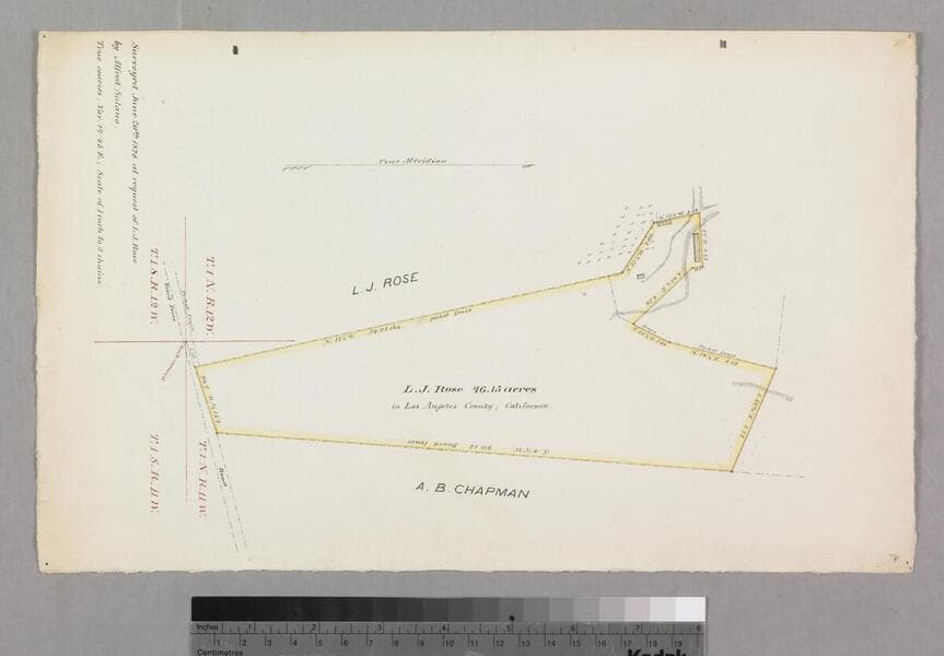 Part of bound document, "Los Angeles, Cal. Aug 10th 1871... Henry Dalton to A.B. Chapman..." Copied from the original by Joseph Schmidt; additions by Alfred Solano; color highlighting, surface detailing; shows acreage, courses, distances, township & section numbers, stations; color highlights. Title supplied by cataloger.