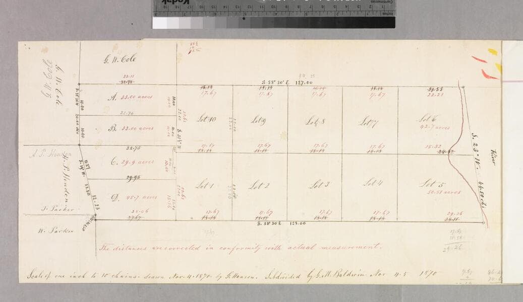 Pgs. 6 of document, "Child's Tract, being a part of the Rancho San Rafael..." showing parcel numbers in red with acreage, owners; courses, distances, waterway, post. Alt. title supplied by cataloger.