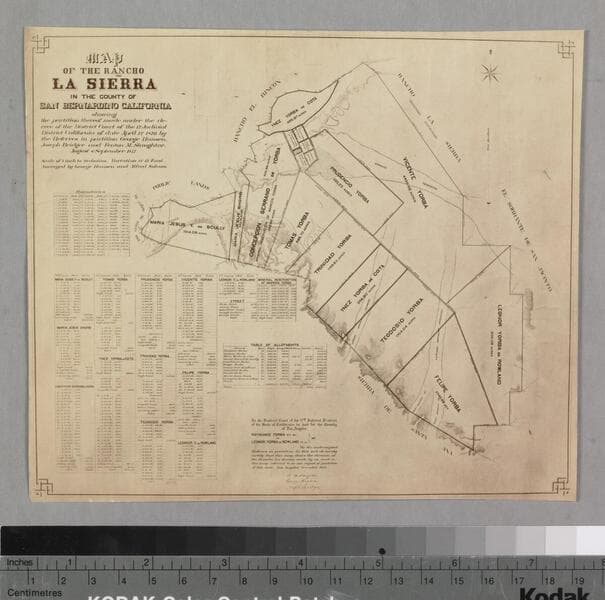 Bound volume: Rancho La Sierra, Partition 1876-1877. Verso & recto of same sheet, showing courses, distances; parcel owners; color on verso map; . Title supplied by cataloger.