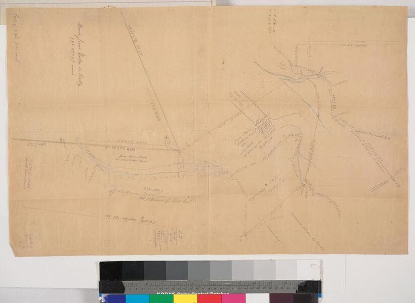 Bound volume: Rancho La Sierra, Partition 1876-1877. Colored pencil; showing acreage, courses, distances, structures, surface detail; calculations Verso: sketch & writing. Title supplied by cataloger.