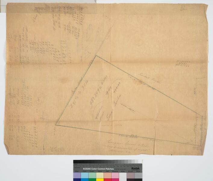 Bound volume: Rancho La Sierra, Partition 1876-1877. Showing courses, distances, acreage; colored pencil; calculations Verso: writing. Title supplied by cataloger.
